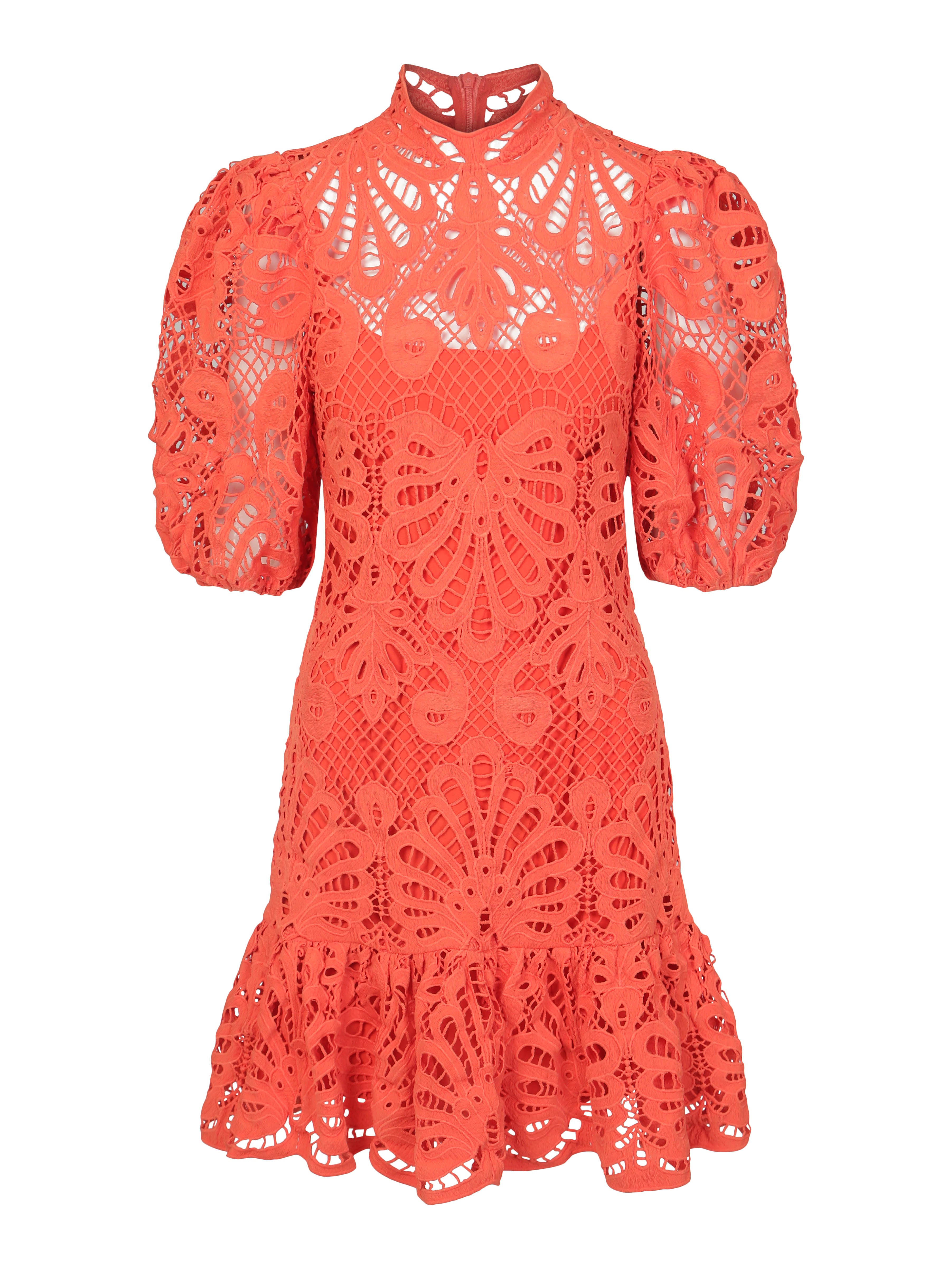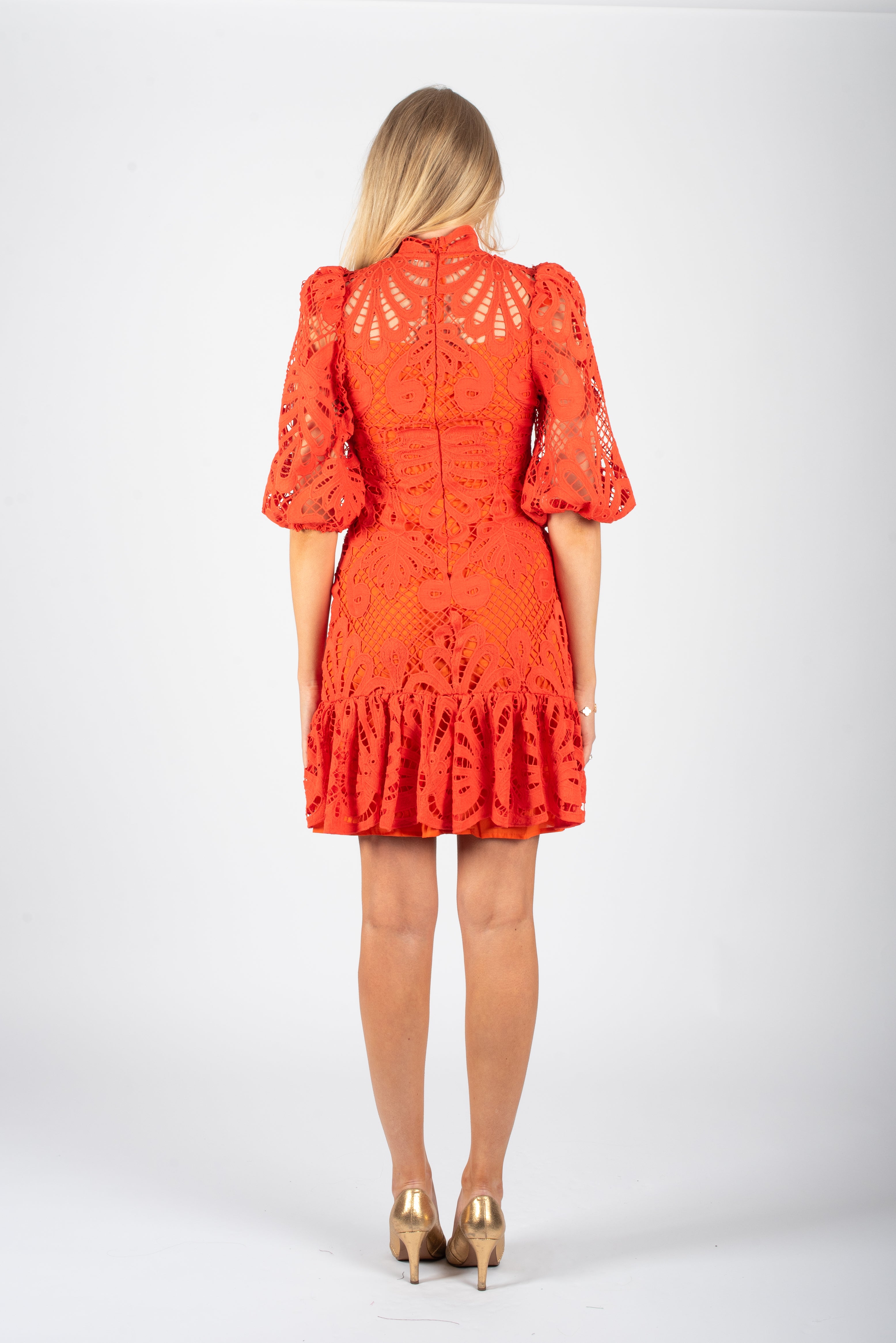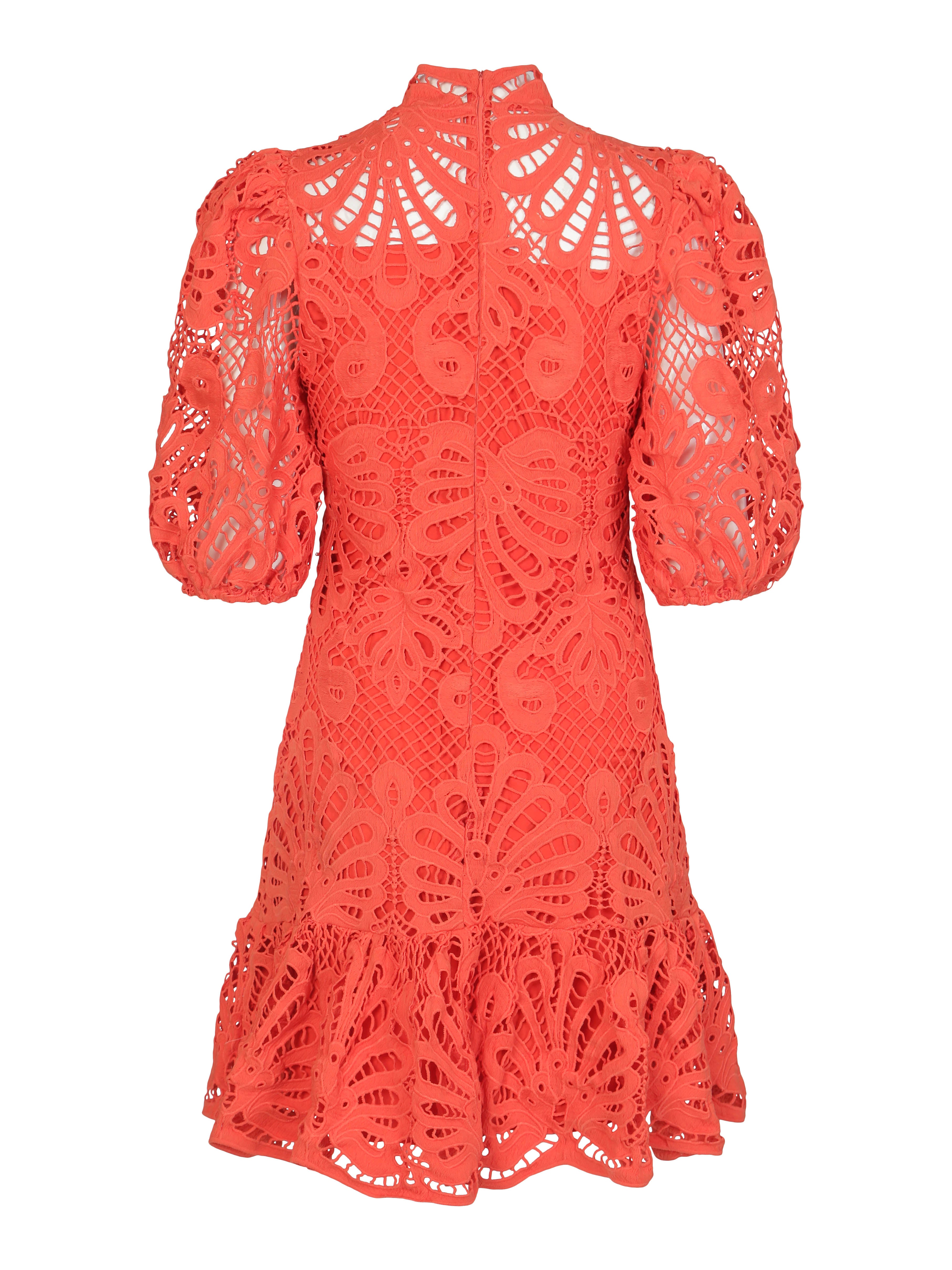 Kjolen har en halv-høy ståkrage som gir kjolen et veldig elegant uttrykk. Korte ermer med litt lengde som går rett over albuen ca. Nydelig liten skjørtekant nederst og skjult glidelås i ryggen.
