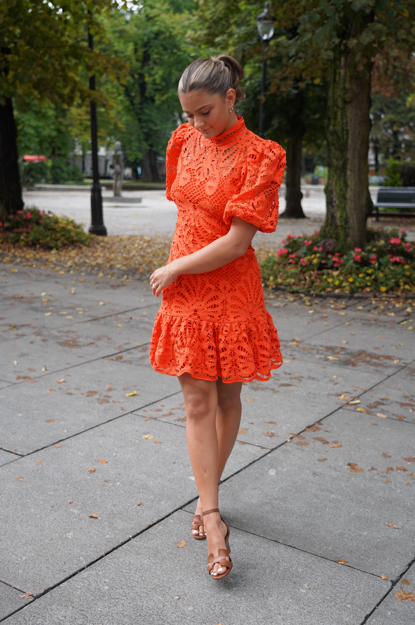 Romantiske detaljer som puffarm og en liten stå krage. Kjolen føller kroppen og går litt ut i bunnen.