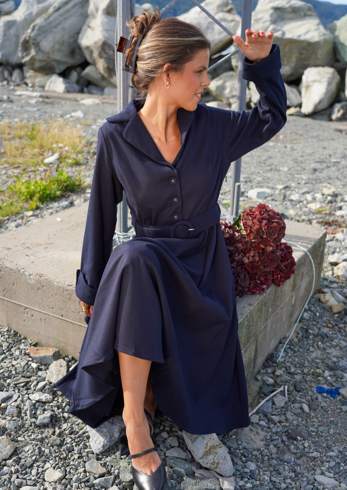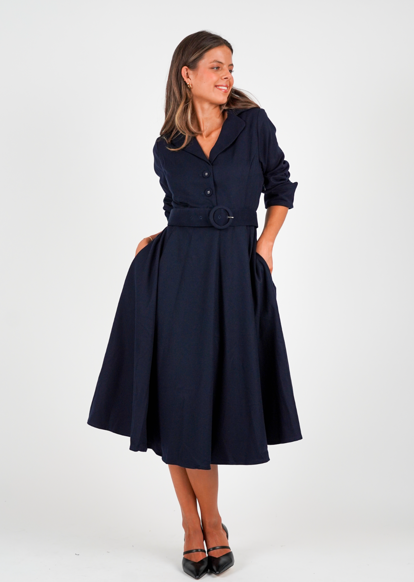 Kjolen har en klassisk lengde som faller under kneet, 3/4-ermer med oppbrett og en tidløs krage som tilfører et sofistikert preg. Med skjult glidelås i siden, åpning i utringningen og et avtagbart belte, får du både funksjonalitet og muligheten til å variere stilen. Lommer i sidene gir en praktisk og moderne touch.