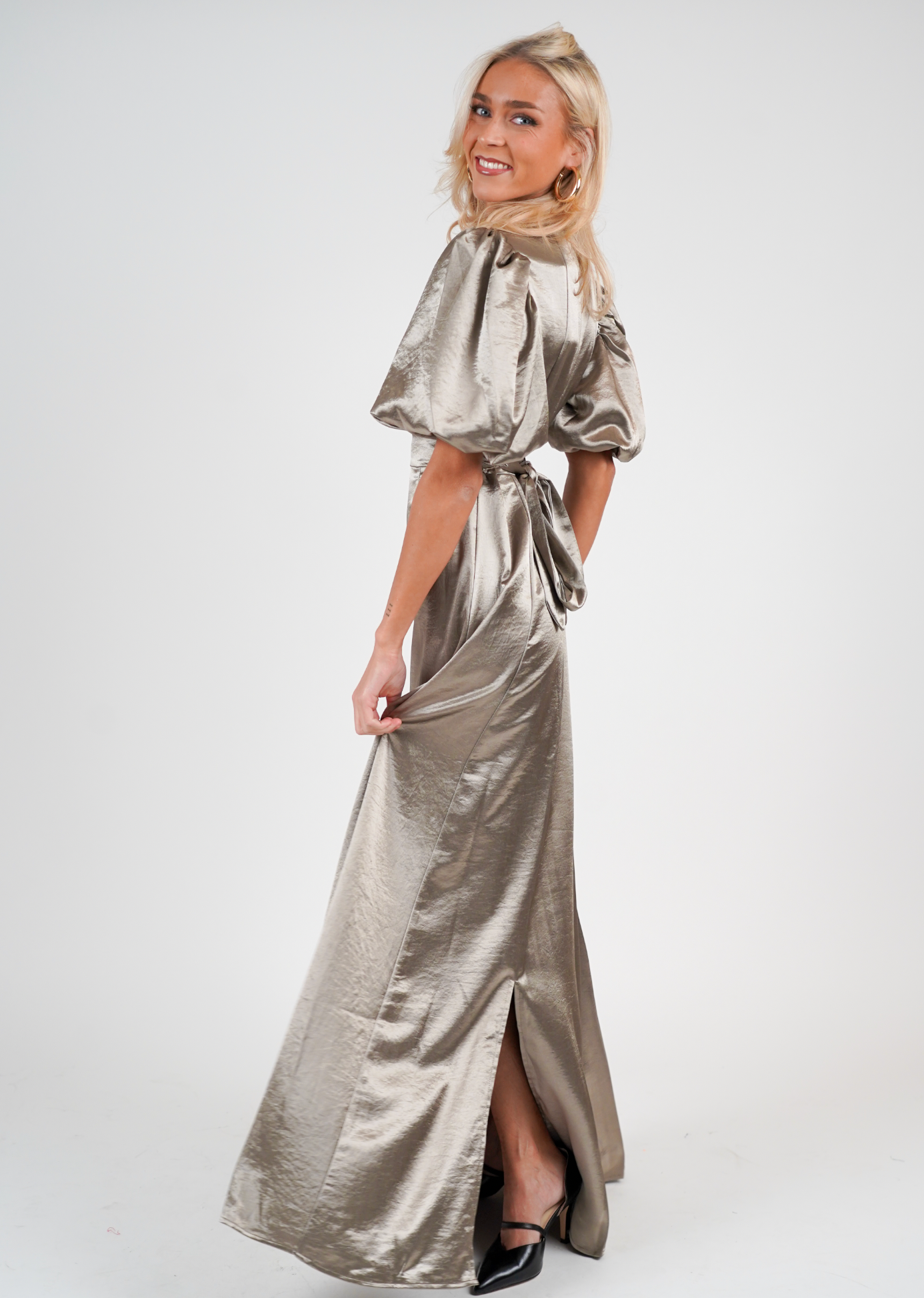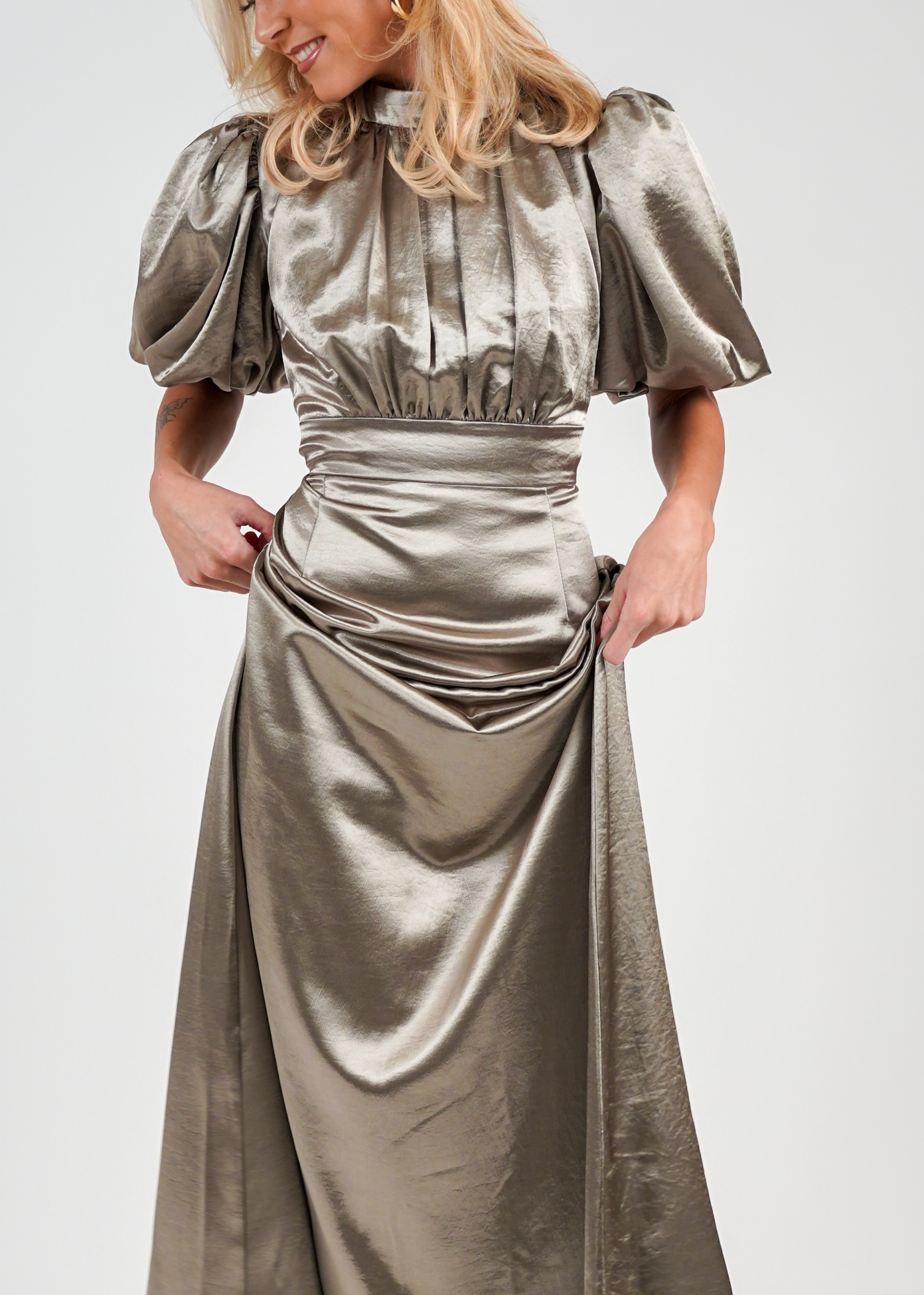 Kjolen har puffede ermer med lett volum, delikat rynking over brystet og et avtagbart belte som markerer midjen på en vakker måte. En skjult glidelås i ryggen gjør den enkel å ta på, mens den lille splitten bak i skjørtet tilfører både bevegelsesfrihet og et subtilt hint av sensualitet. Underkjolen er laget i et mykt og behagelig stoff som gir komfort hele dagen eller kvelden.