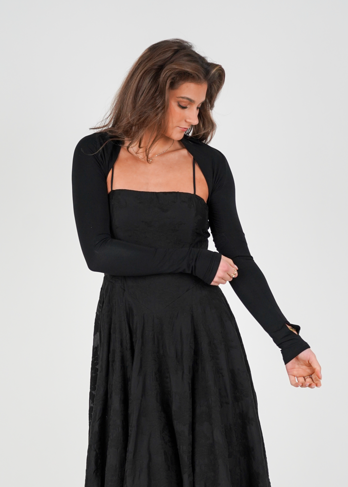 Passformen er tettsittende over ermene og øvre del av ryggen, noe som gir et stilrent og sofistikert uttrykk uten å ta fokus bort fra kjolen. Boleroen er et ideelt plagg når du ønsker litt mer dekning over skuldre og bryst, samtidig som du bevarer den elegante helheten.