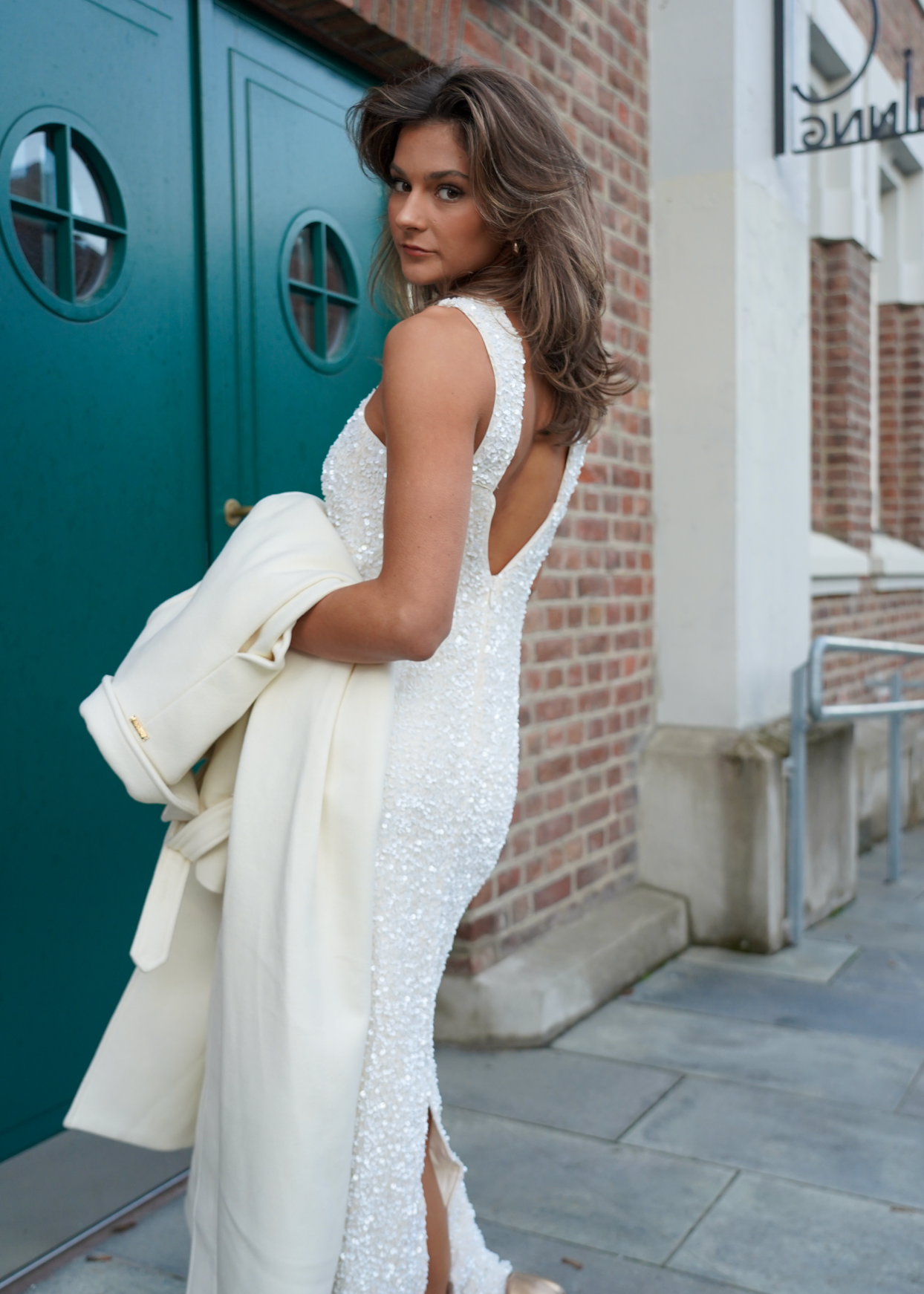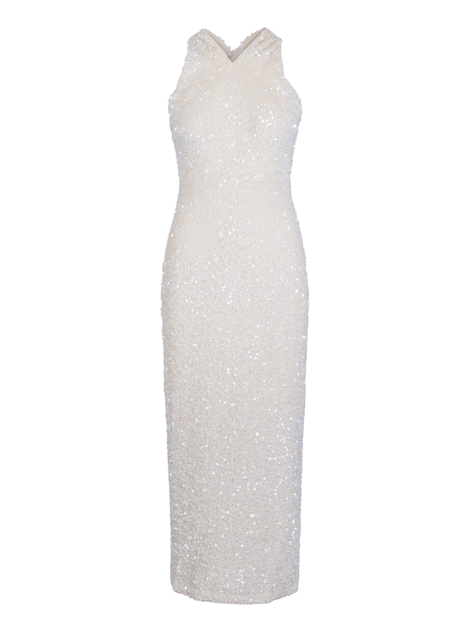 Kjolen har nydelige og eksklusive paljetter som glitrer i lyset. For at kjolen ikke skal være ubehagelig å ha på har vi sørget for at paljettene ikke ligger på plasser som er irriterende for huden, som under armen for eksempel.