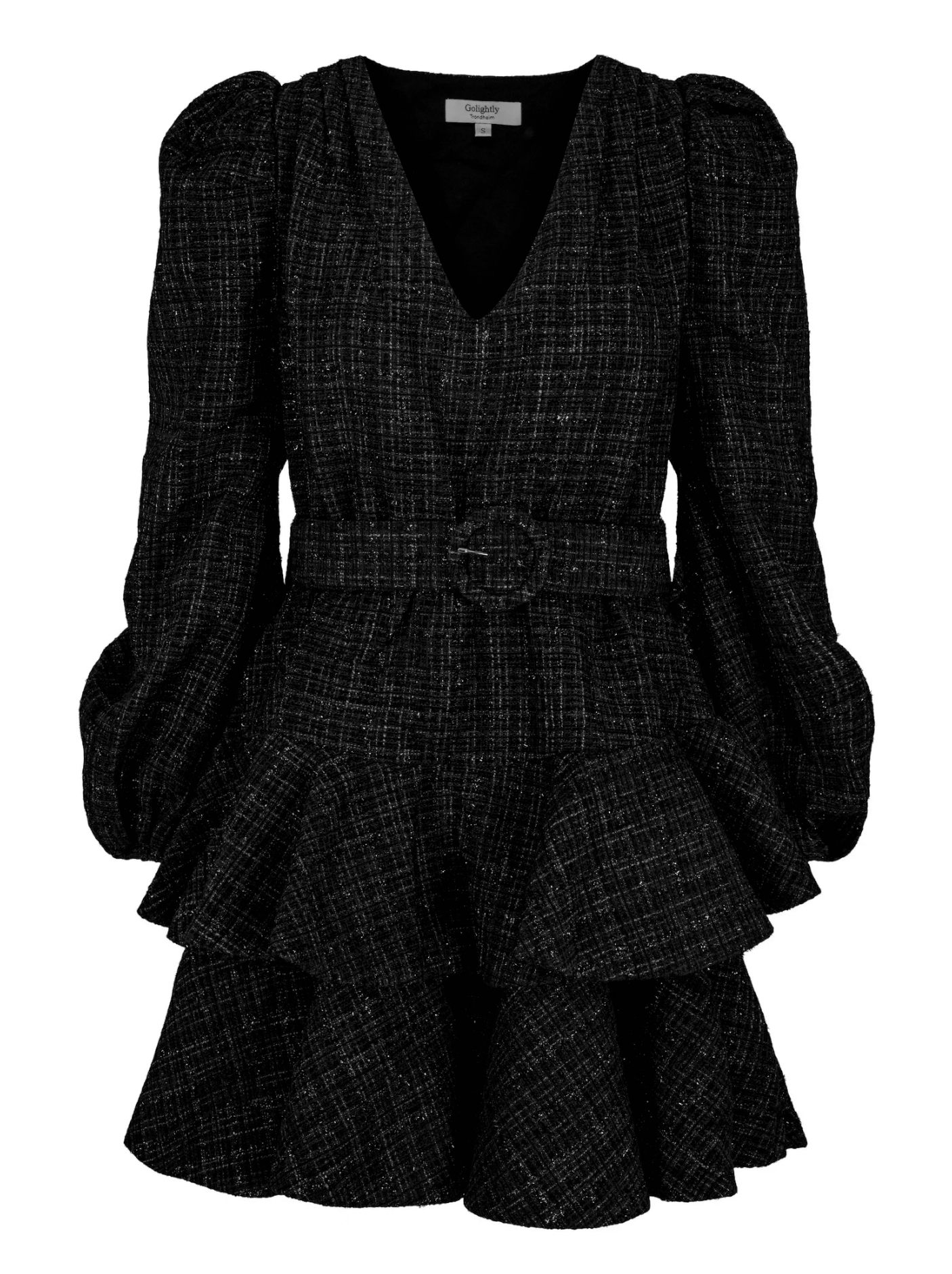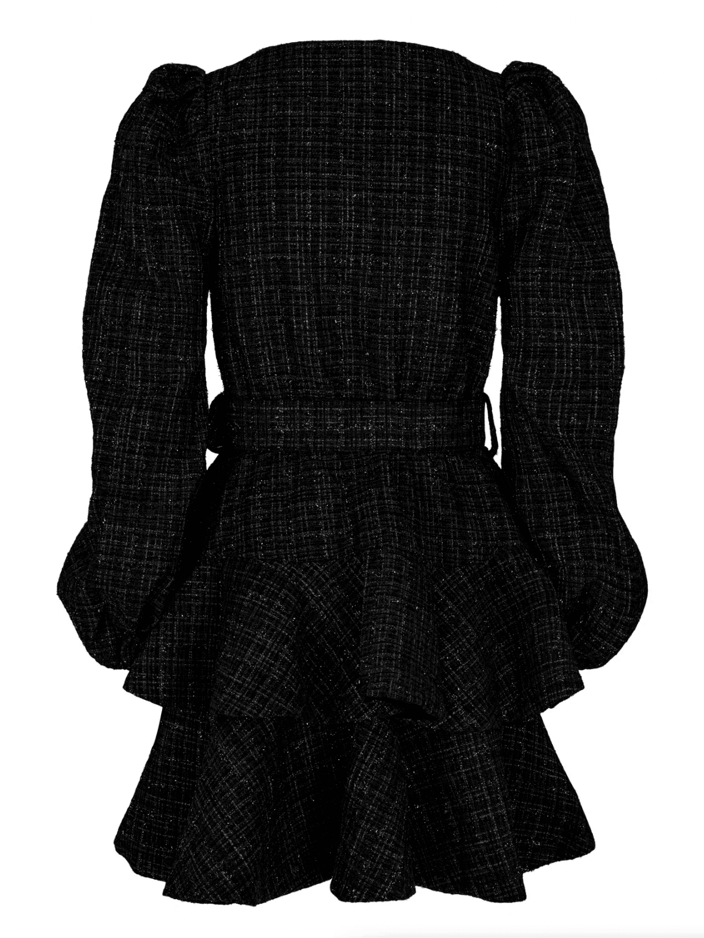 Kjolen er laget i et vakkert tweedstoff med små glitrende detaljer som gir et luksuriøst preg. Den er foret på innsiden for å sikre komfort, og føles behagelig mot huden selv gjennom lange kvelder med dans og hygge. En flatterende utringning, elastisk midje og avtagbart belte gir kjolen en vakker silhuett, mens den lille puffen i skuldrene tilfører en sofistikert touch.