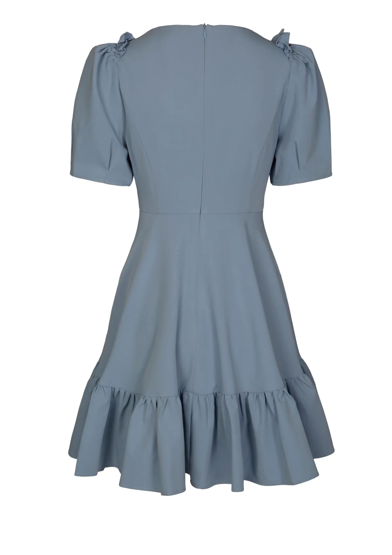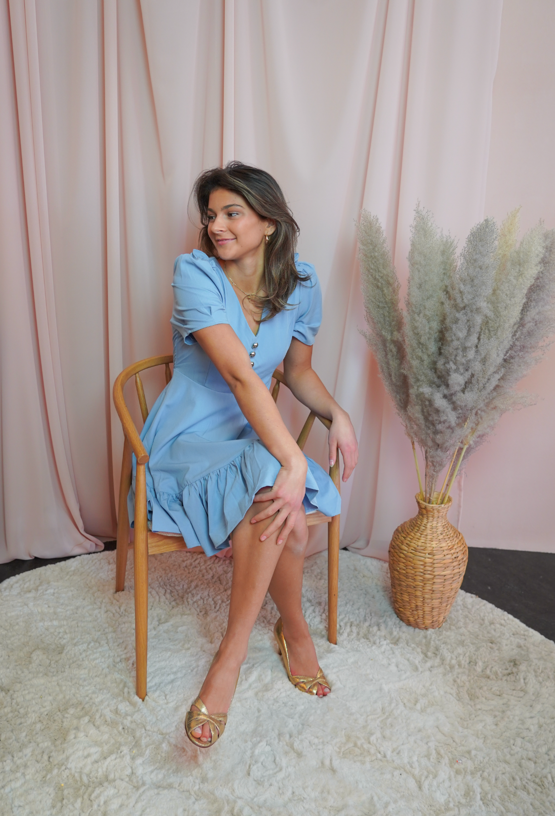 Nydelige kjole med v-hals, liten, kort puff arm, rynking over skulderen påsydd volang i nederkant på skjørtet og gullknapper over brystet. Den perfekte kjolen i et lett og luftig materiale. Finnes i fargene grønn, rosa, hvit og blå.