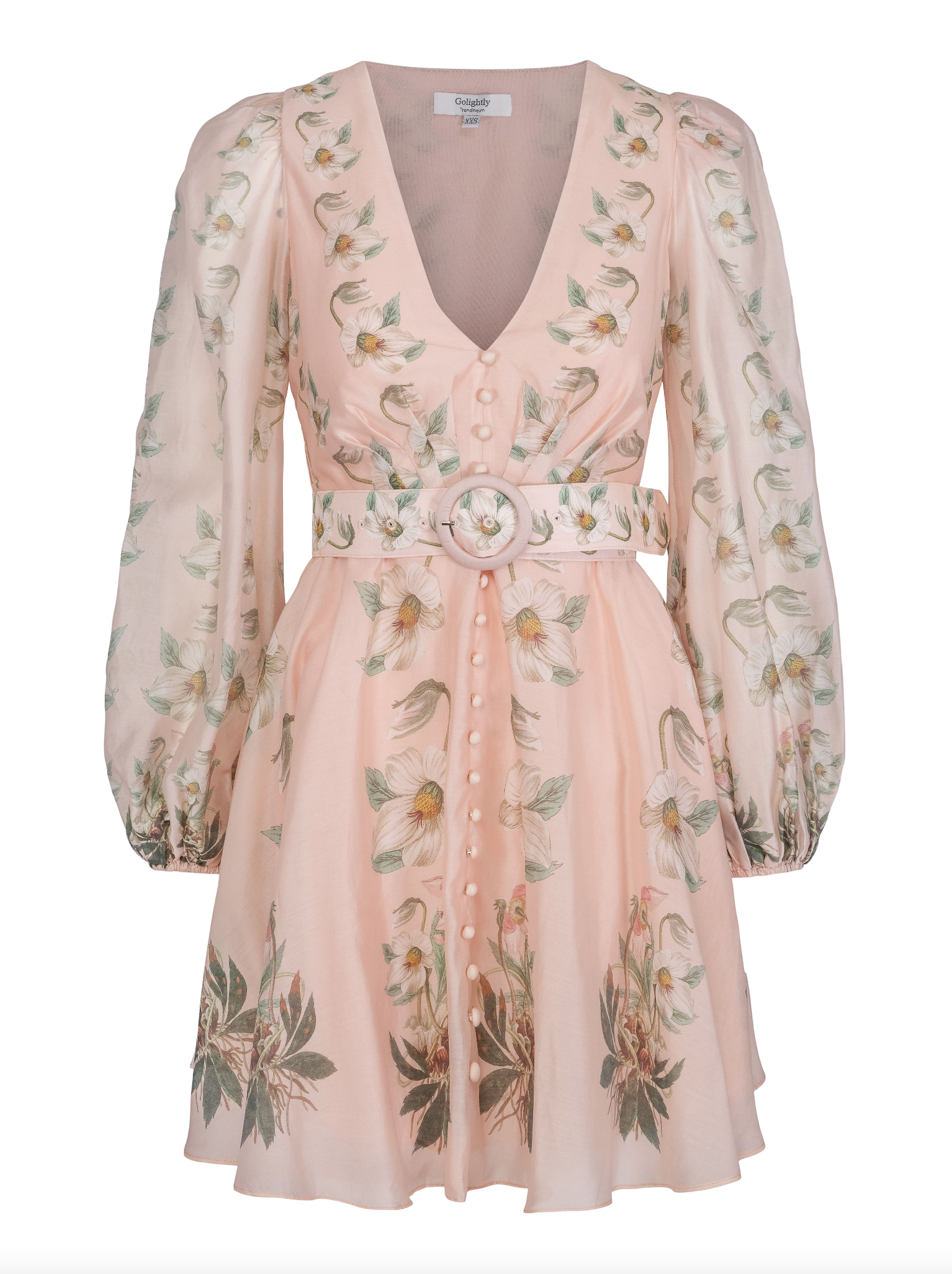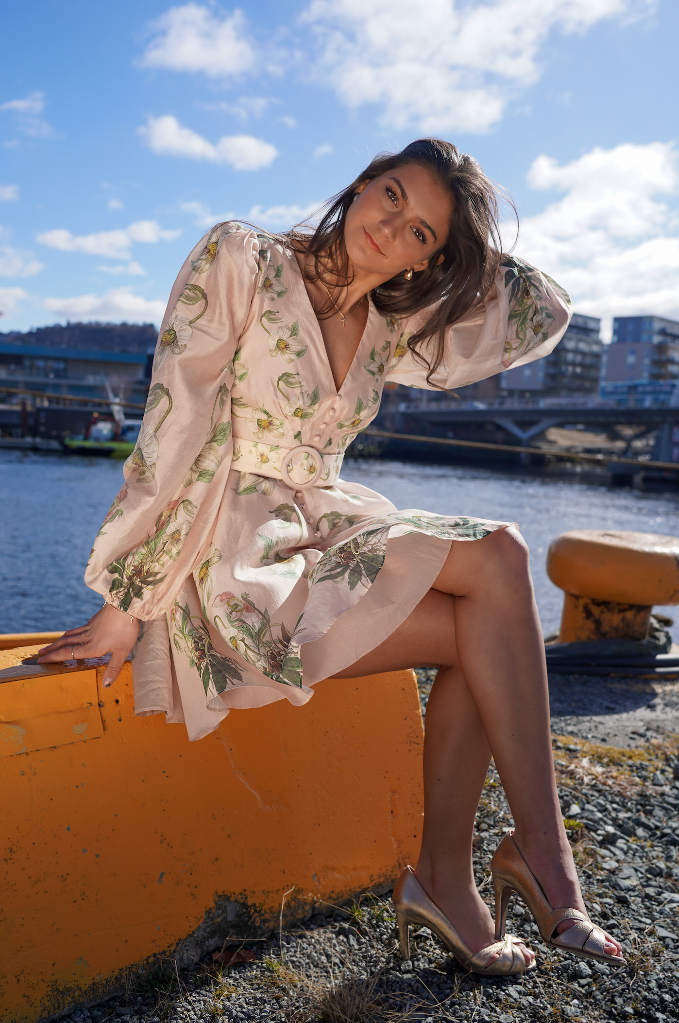 Kjolen har lange ermer med strikk som gir en feminin puff-effekt, en vakker V-utringing og avtagbart belte i livet som fremhever midjen. Den har knepping i front som gir et sofistikert uttrykk, samt skjult glidelås i siden for en sømløs finish.