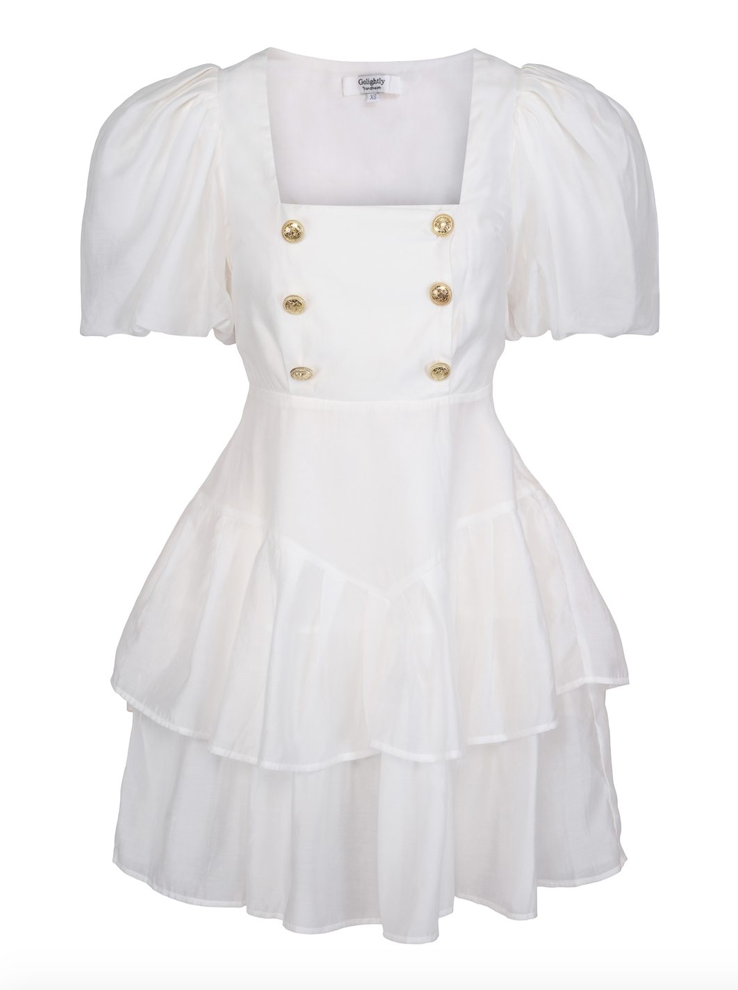Alle knappene kan brukes for å åpne kjolen når du tar den av og på. Det er i tillegg en skjult glidelås i siden.