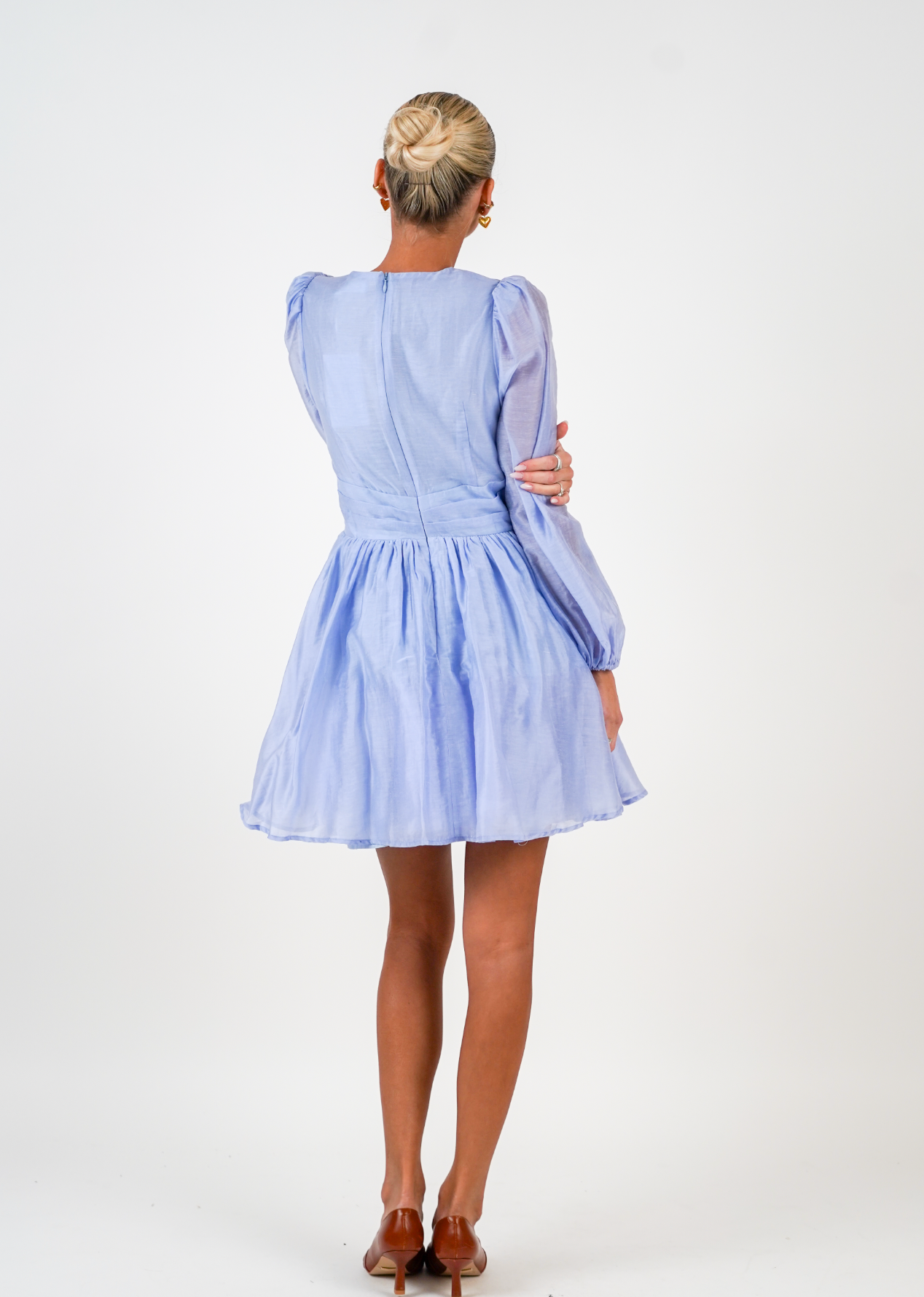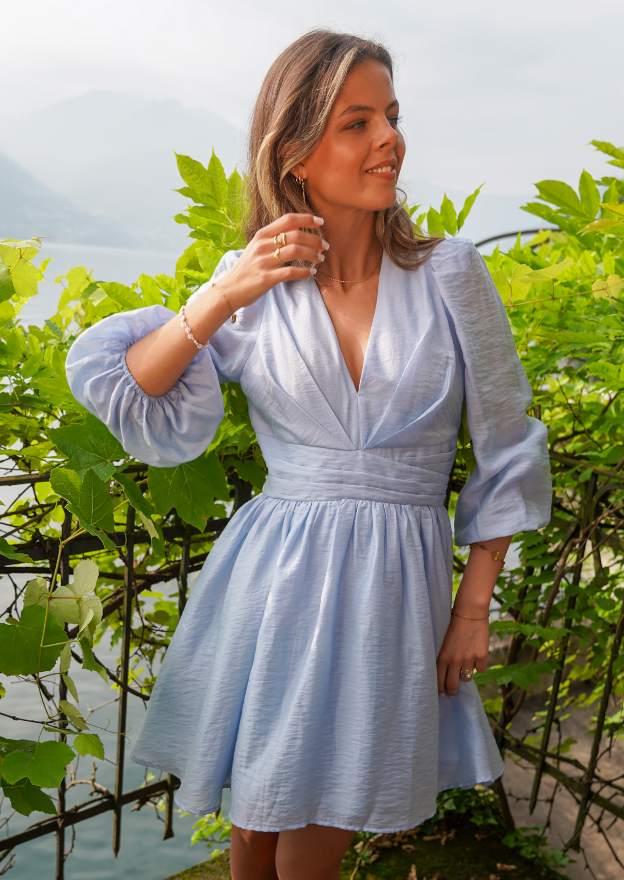 Kjolen har vide ermer med strikk nederst som gir en myk og feminin silhuett. Et bånd under brystet fremhever midjepartiet, mens den dype utringingen gir et sofistikert uttrykk. For deg som ønsker litt mer dekning, kan kjolen enkelt styles med en undertopp i samme farge.