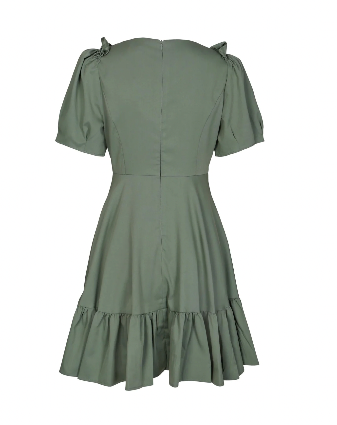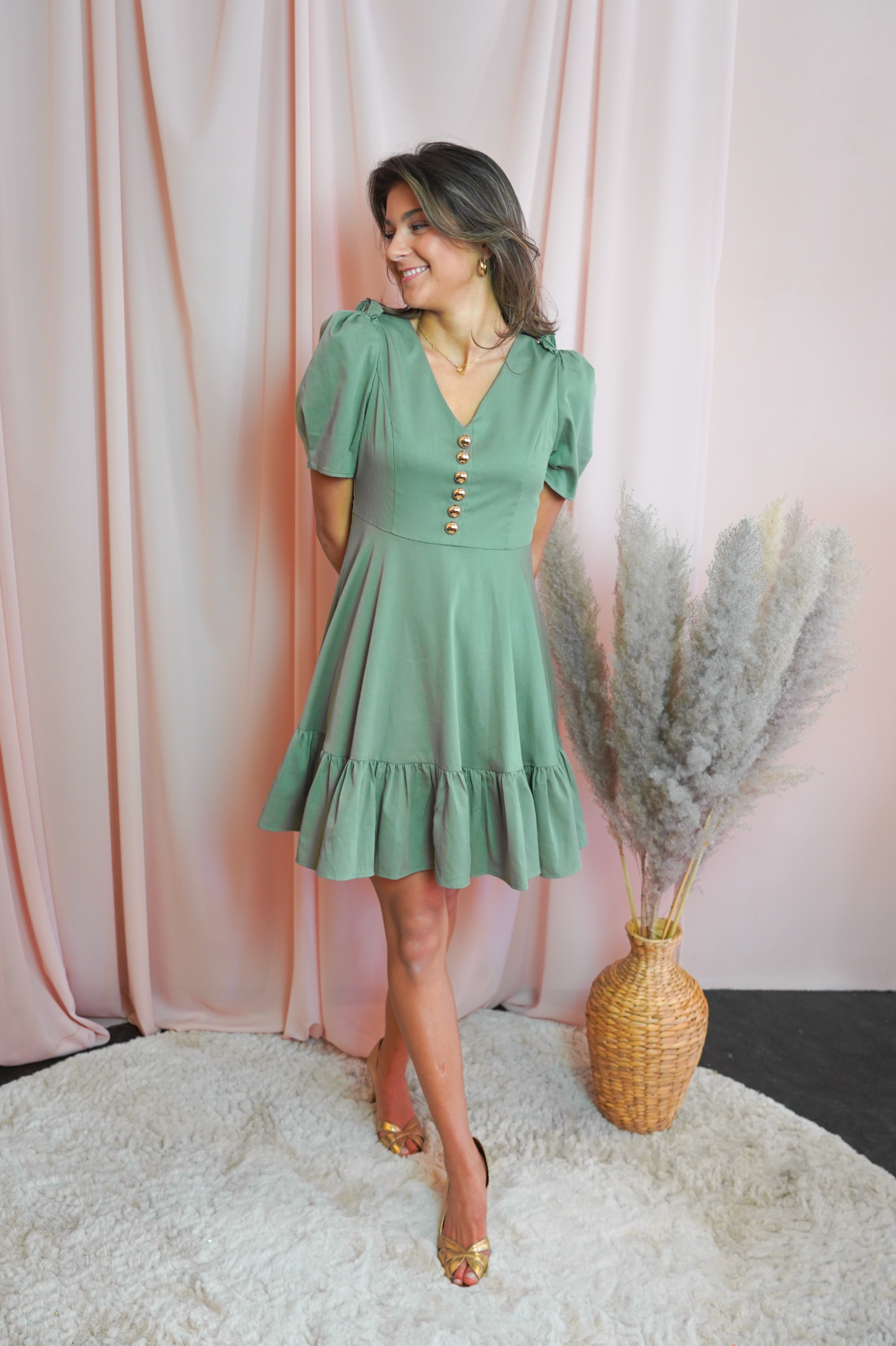 Nydelige kjole med v-hals, liten, kort puff arm, rynking over skulderen påsydd volang i nederkant på skjørtet og gullknapper over brystet. Den perfekte kjolen i et lett og luftig materiale. Finnes i fargene grønn, rosa, hvit og blå.