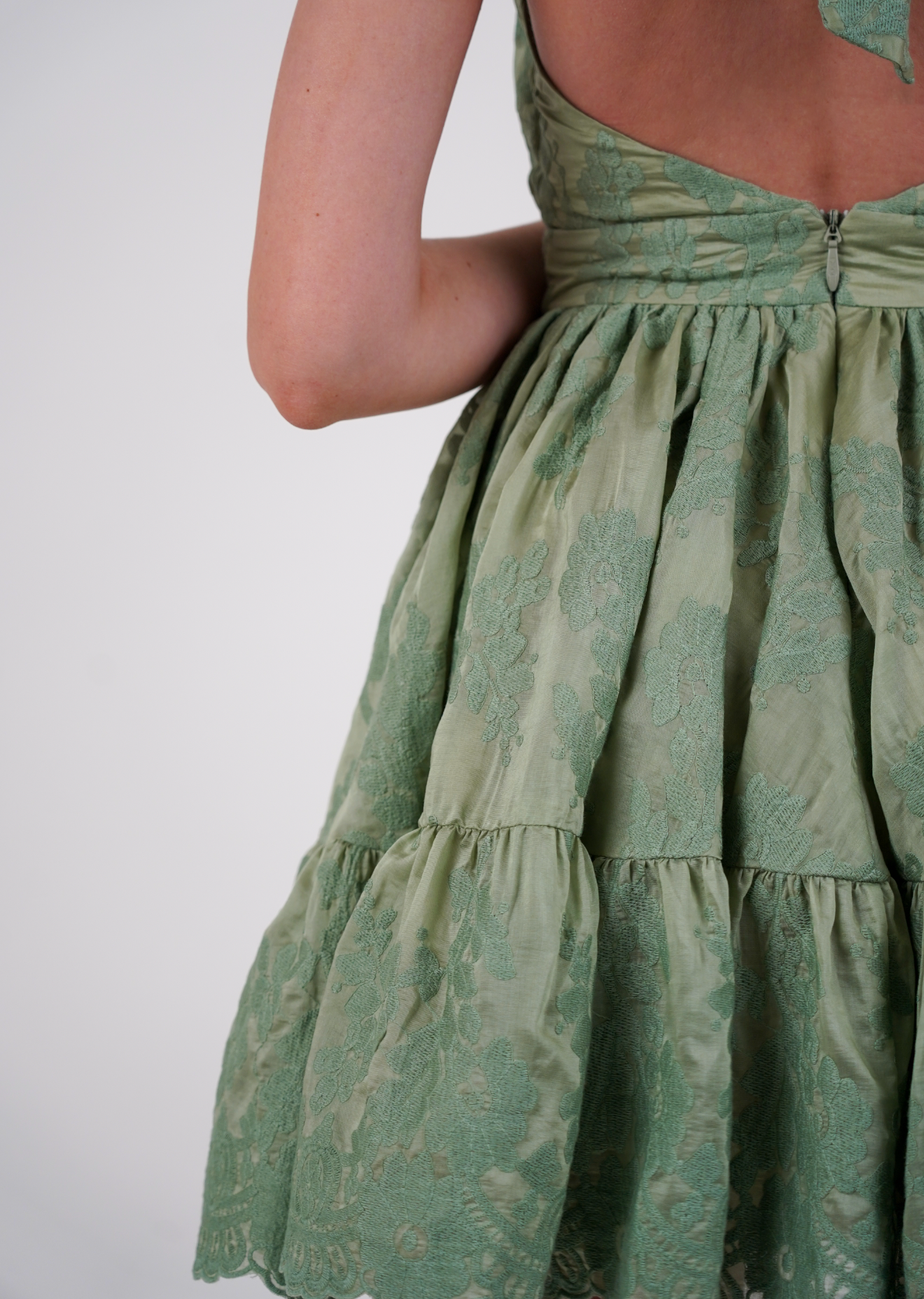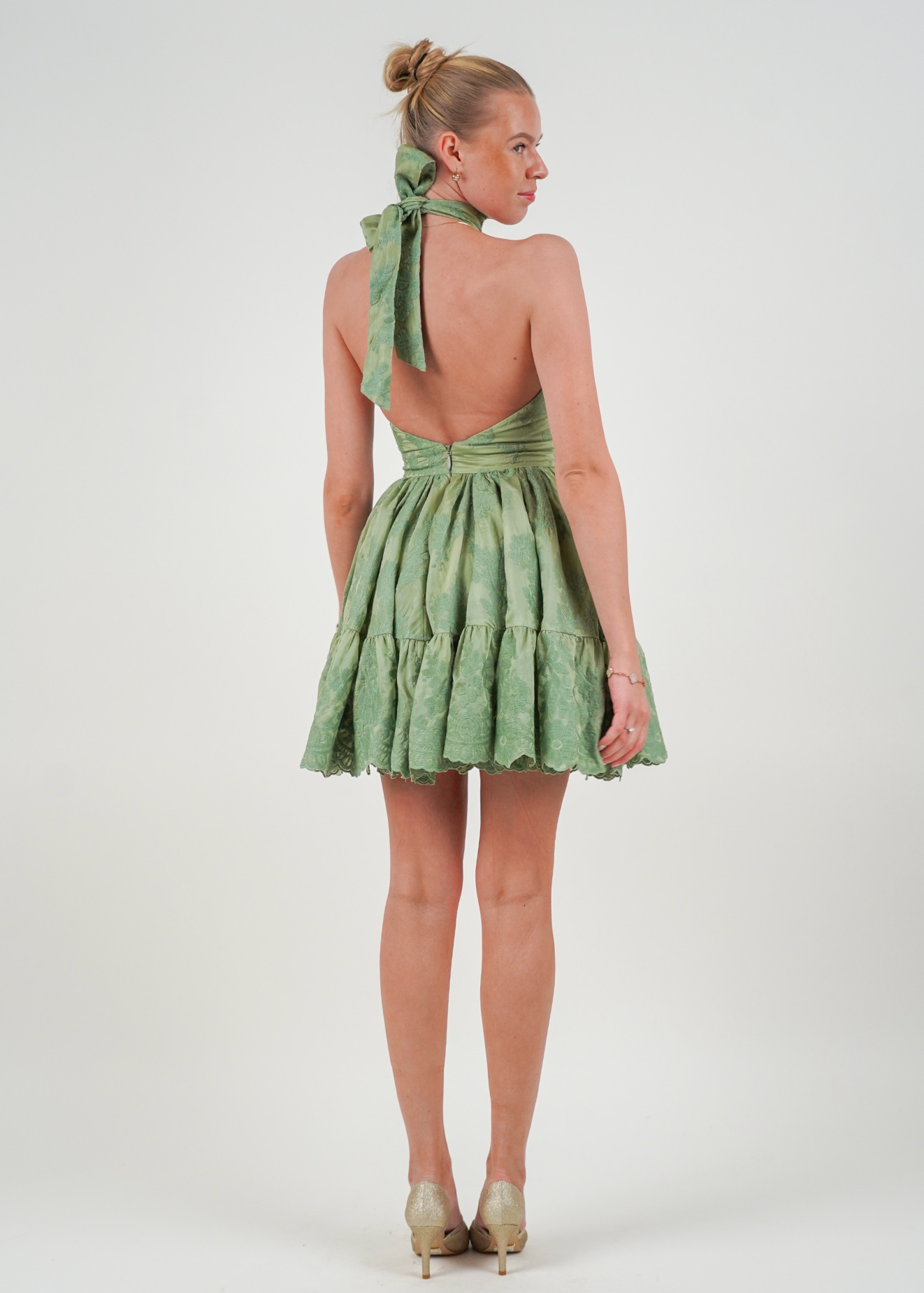 Det korte skjørtet balanseres av volumet i tyllen, noe som gir et sofistikert og lekent uttrykk uten å føles for kort. Toppen knytes elegant med en sløyfe i nakken, mens den skjulte glidelåsen i ryggen på skjørtet sørger for en sømløs og behagelig passform.
